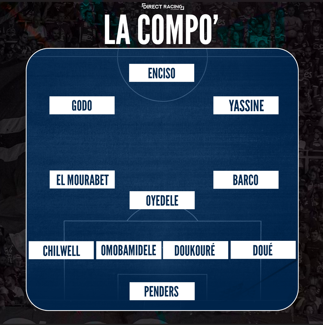 Le 11 : Penders – Chilwell, Omobamidele, Doukouré, Doué, Oyedele, Barco, El Mourabet, Godo, Yassine, Enciso