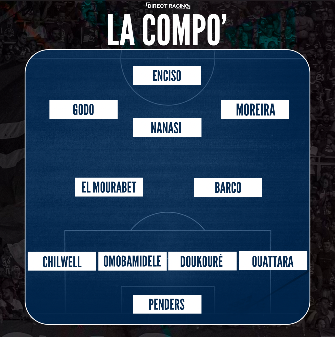Le 11 : Penders – Moreira, Chilwell, Omobamidele, Doukoué, El Mourabet, Barco, Ouattara, Nanasi, Godo, Enciso