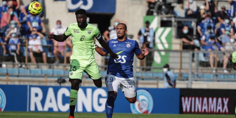Saadi Idriss and Ecuele Manga bruno during the French L1 football match between Strasbourg (RCSA) and Dijon (DFCO) at the Meinau stadium in Strasbourg, eastern France, on September 20, 2020.