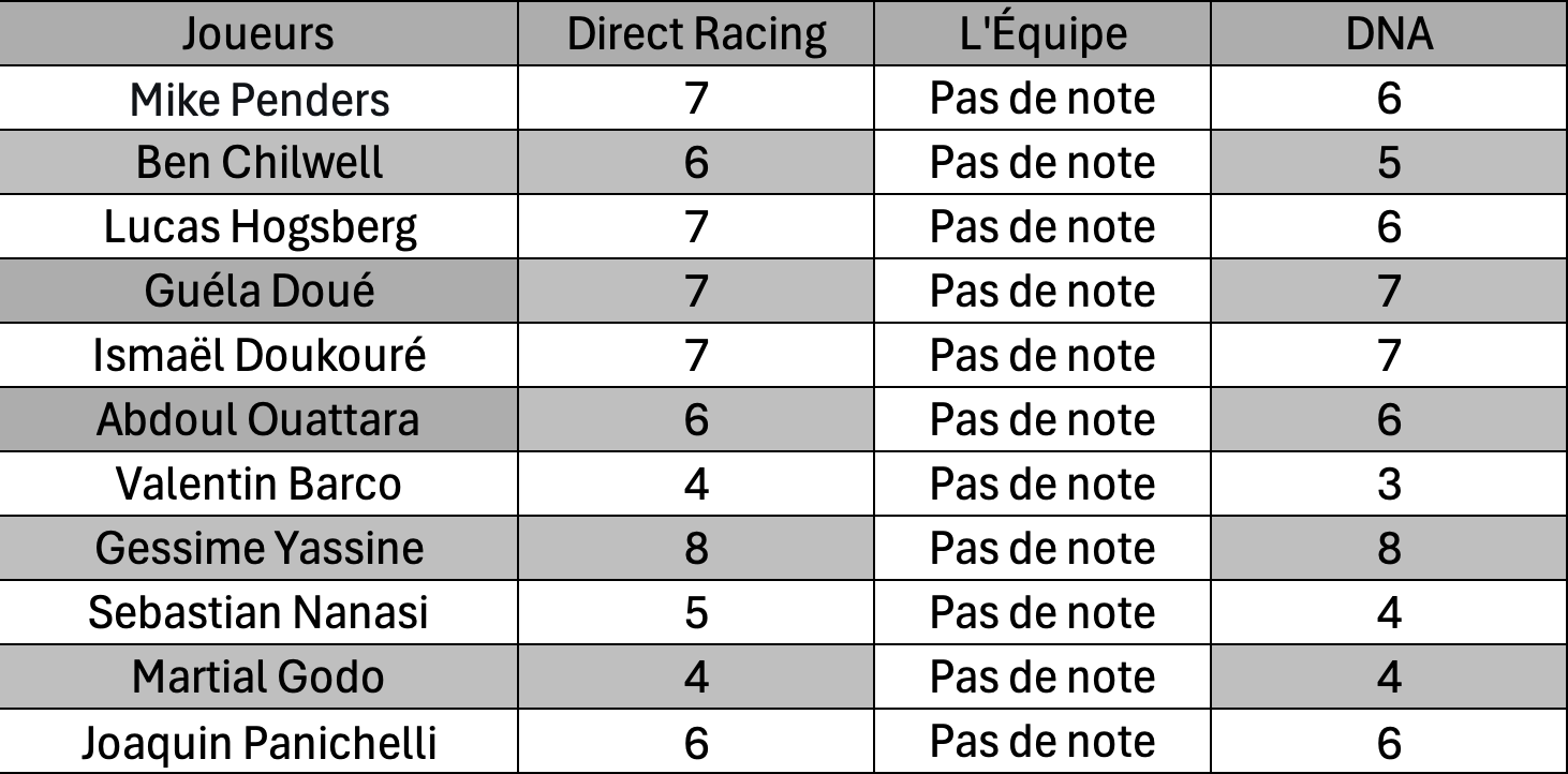 Comme après chaque match, Direct Racing vous propose ses notes, accompagnées de celles des DNA. À noter que L’Équipe n’a pas attribué de notes aux joueurs pour cette rencontre.