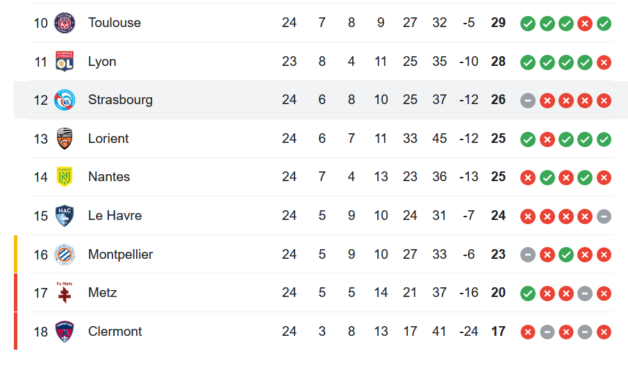 Avant cette 24e journée de Ligue 1, le Racing Strasbourg comptait huit unités d’avance sur le premier relégable Metz. Mais la victoire du rival messin à Nantes (0-2) jumelée au nul du club strasbourgeois à Montpellier (2-2), ce dimanche, fait que les Alsaciens n’ont plus que six points de plus que les Lorrains, qui occupent toujours la 17e place du championnat. Dans le bas du classement, la lanterne rouge Clermont (18e, 17 points) s’est lourdement inclinée contre Marseille (1-5). Barragiste avant ce week-end de football, Lorient a crée la surprise en allant s’imposer à Rennes (1-2) dans un derby 100% breton. Les Merlus remontent sur la 13e marche à une seule longueur de Strasbourg (12e, 26 points), qui passe devant les Canaris nantais (14e, 25 points) et compte toujours trois points d’avance sur le nouveau barragiste montpelliérain (16e, 23 points). A noter, dans cette lutte acharnée pour le maintien, la courte défaite du Havre (15e, 24 points) chez le solide dauphin du PSG, Brest (1-0).