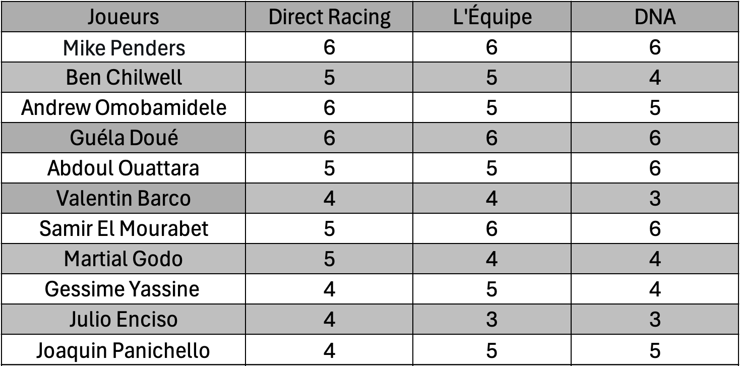 Les notes de la presse traduisent d’ailleurs cette prestation globalement décevante. Aucun joueur du Racing ne parvient à véritablement tirer son épingle du jeu, avec des évaluations plutôt basses dans les trois médias. Mike Penders obtient la moyenne (6) partout, tandis que plusieurs cadres offensifs comme Julio Enciso, Martial Godo ou Joaquin Panichelli restent en dessous des attentes.