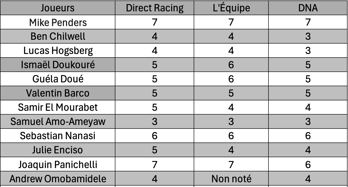 Enfin, Andrew Omobamidele n’a pas été noté par L’Équipe.
