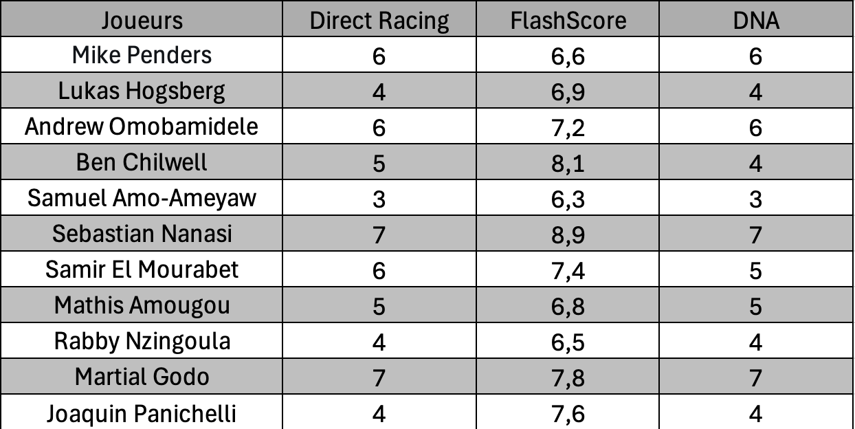 Pour cette rencontre, nous avons exceptionnellement remplacé les notes de L’Équipe par celles de FlashScore, auxquelles s’ajoutent celles des Dernières Nouvelles d’Alsace et de Direct Racing.