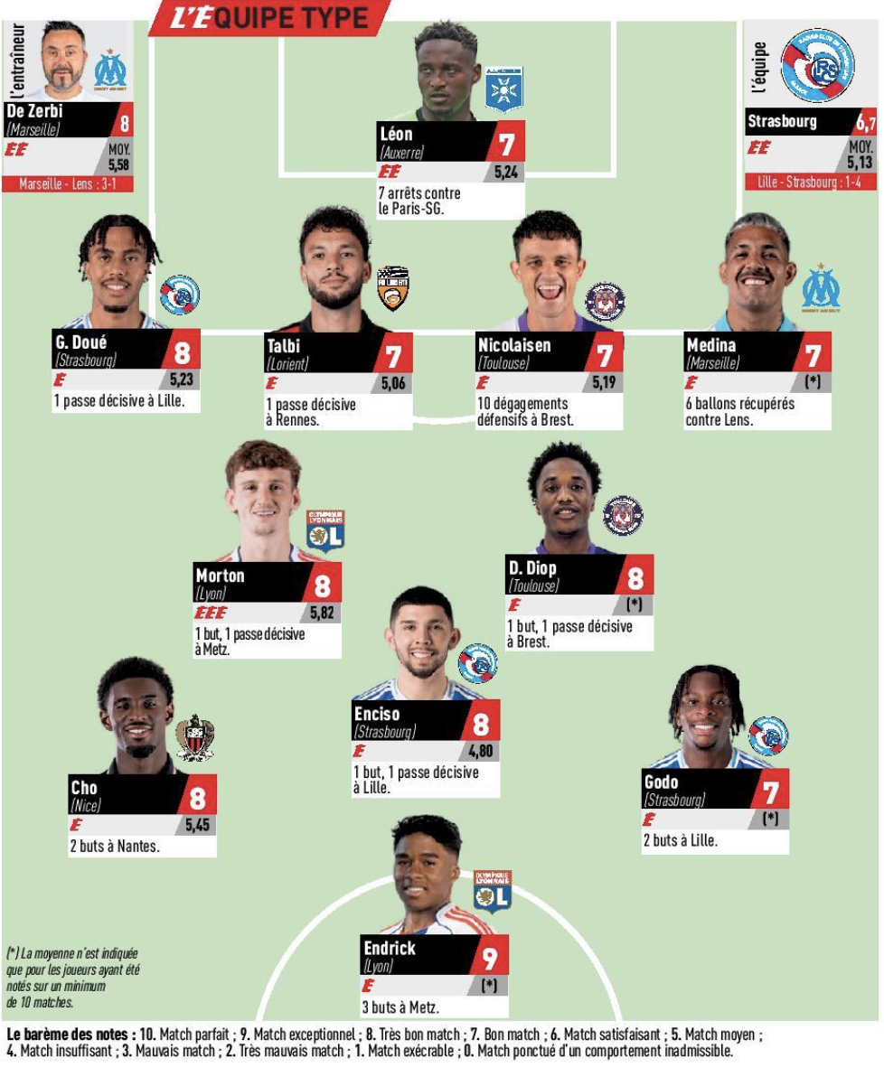 Strasbourg a livré un récital offensif dimanche soir sur le terrain de Lille (J19). Le tout en ayant comme toujours assumé de se découvrir, Lille s’étant malgré tout procuré énormément d’occasions (20 tirs, 6 cadrés), et en ayant été lui-même plutôt efficace en marquant quatre fois sur six tentatives cadrées. Une hausse globale du niveau de l’équipe dont trois joueurs sont ressortis selon le onze type réalisé comme après chaque journée par le quotidien L’Équipe. Strasbourg est l’équipe la plus représentée avec trois éléments : Guéla Doué (1 pd), Julio Enciso (1 b et 1pd) et Martial Godo (doublé).
